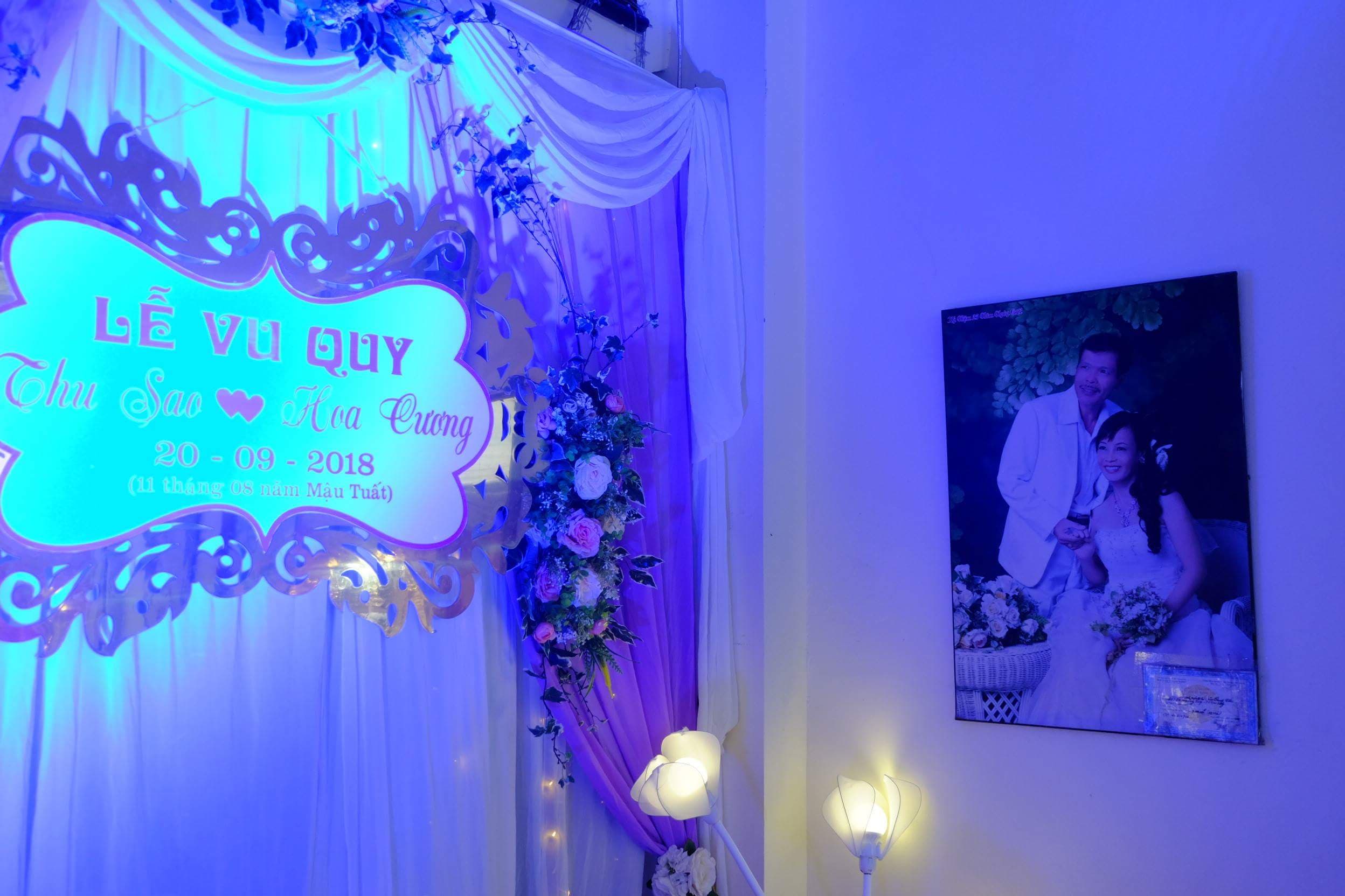 Ảnh cưới của chị Thu Sao và người chồng quá cố vẫn được treo ở phòng khách.