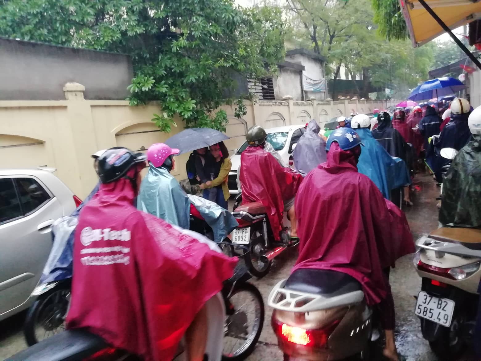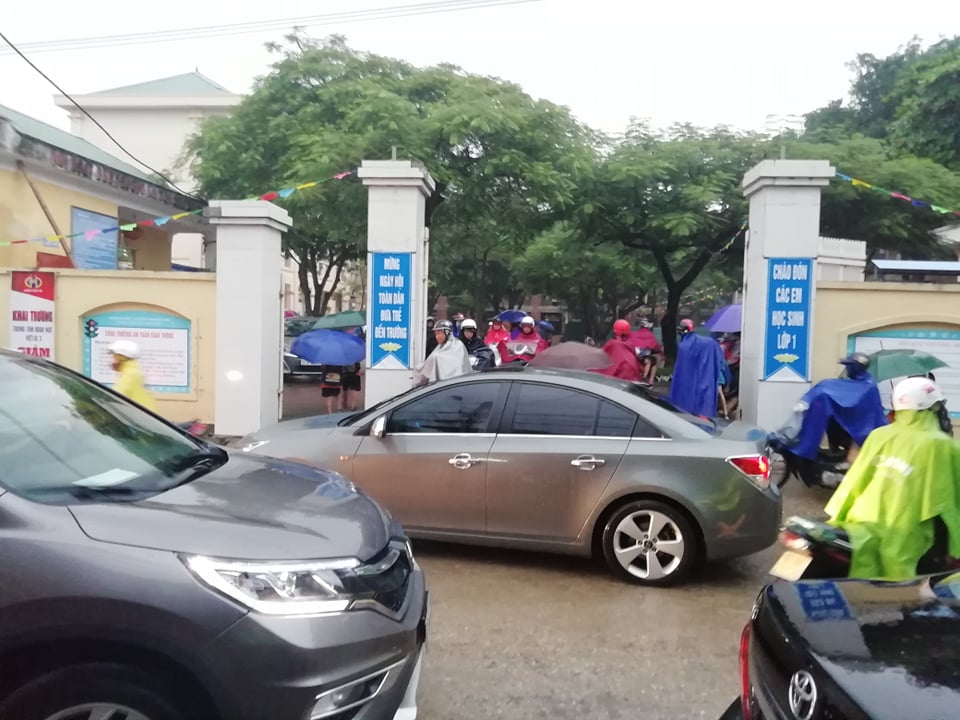 Các phụ huynh trường tiểu học Trung Đô đội mưa đưa con đến trường