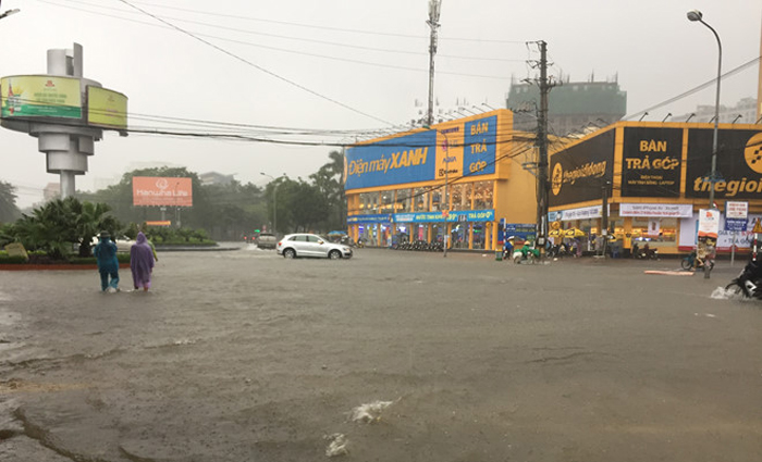 Mưa lớn, kéo dài gây ngập úng sâu đúng vào thời gian cao điểm buổi sáng thứ 7 cuối tuần khiến giao thông hỗn loạn, ùn tắc nghiêm trọng, nhiều đoạn đường tê liệt hoàn toàn. Các cửa hàng phải đóng cửa, người dân dùng bao tải cát ngăn nước tràn vào nhà.