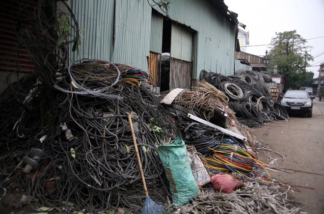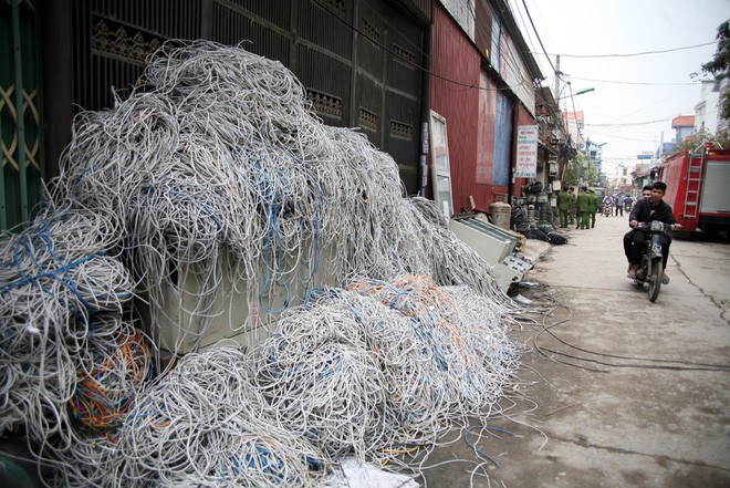 Các loại dây cáp điện, cáp mạng internet, cáp truyền hình… đều được “mổ” lấy đồng, còn phần vỏ nhựa giá trị thấp sẽ chất thành đống ven đường chờ xe tải mang nơi khác tái chế.
