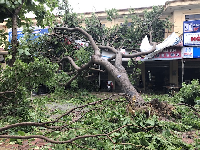 1 cây canh lớn đổ đè lên 4 nhà dân trên đường Lê Lợi. May mắn đã không có ai bị thương.