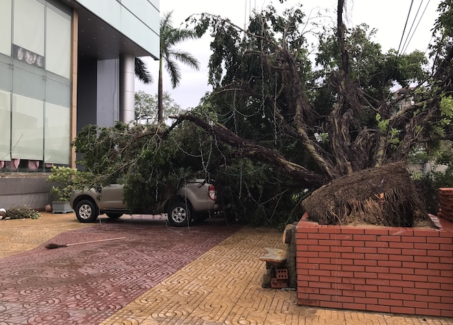 Một chiếc ô tô bán tải đậu trước khách sạn Thượng Hải Vinh đã bị cây xanh lớn đổ đè lên toàn bộ.