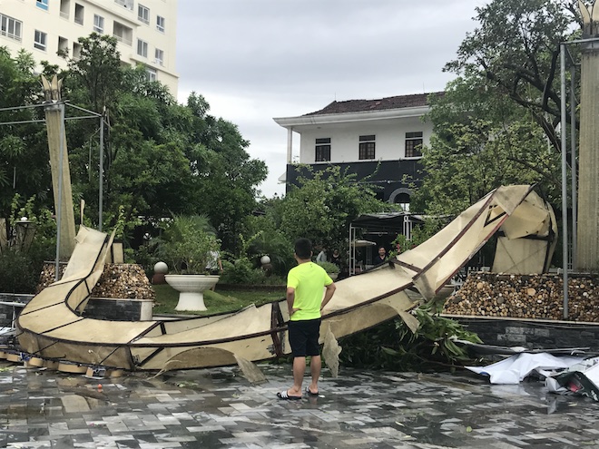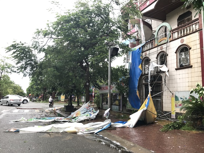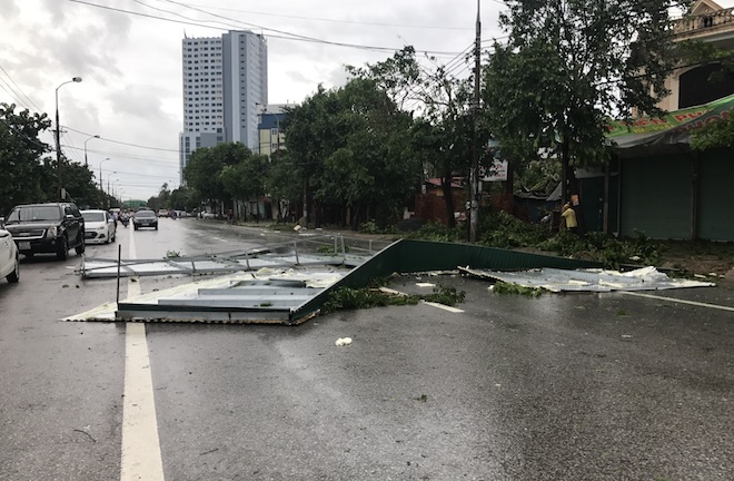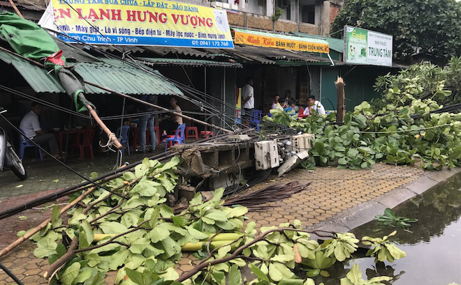 Nhiều cổng, mái ngói của các nhà hàng, quán cafe trên địa bàn TP. Vinh bị hư hỏng. Người dân cho biết, cơn bão đổ bộ vào, đi qua TP. Vinh vào khoảng hơn 2h sáng 17/7. Thời điểm đó, người dân nghe tiếng gió rú rít, nhiều cây xanh đổ nhưng chỉ dám ngồi trong nhà ẩn náu.