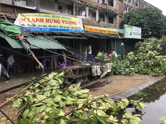 Một cột điện bằng bê tông đổ sập cuốn theo nhiều dây điện và cây xanh tại đường Phan Chu Trinh.