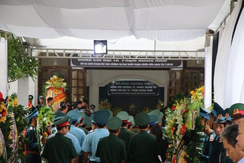 Sáng 28/7, tại nhà tang lễ Bệnh viện Quân khu 4 (TP Vinh, Nghệ An) đã long trọng diễn ra lễ viếng và truy điệu 2 phi công hi sinh trong vụ rơi máy bay Su-22. Hàng ngàn cán bộ chiến sĩ, họ hàng đã có mặt từ sáng sớm để tham dự lễ viếng.