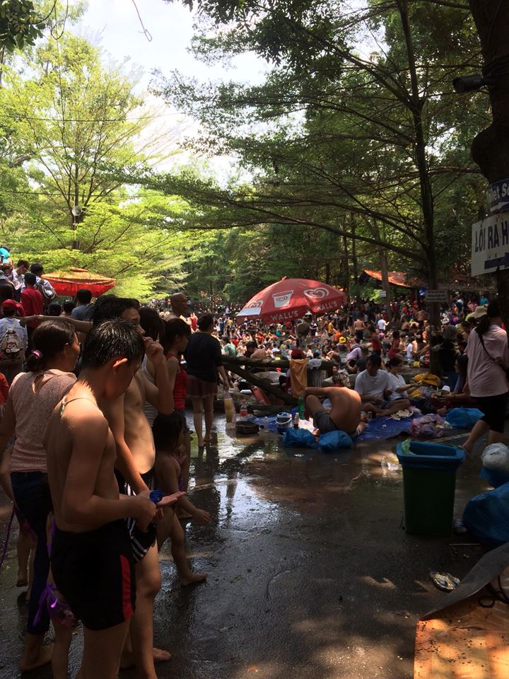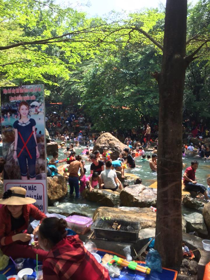 Dưới suối nước trong vắt, nhiều người tranh thủ xuống tắm dù là thời gian giữa trưa. Tại các gốc cây, du khách tập trung lại ăn uống, nghỉ ngơi. Nhiều người còn trải bạt, bày đồ ăn và nghỉ qua trưa.