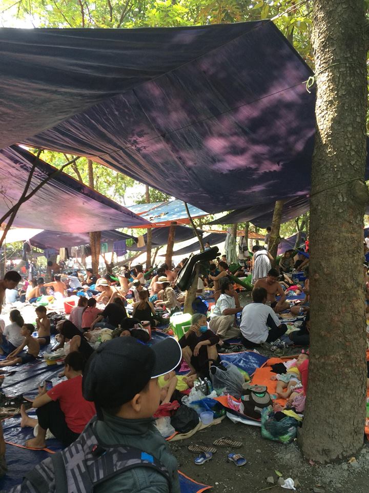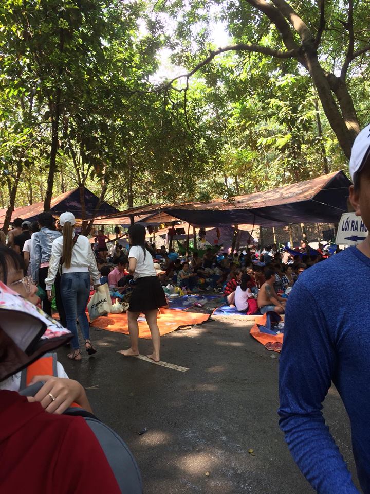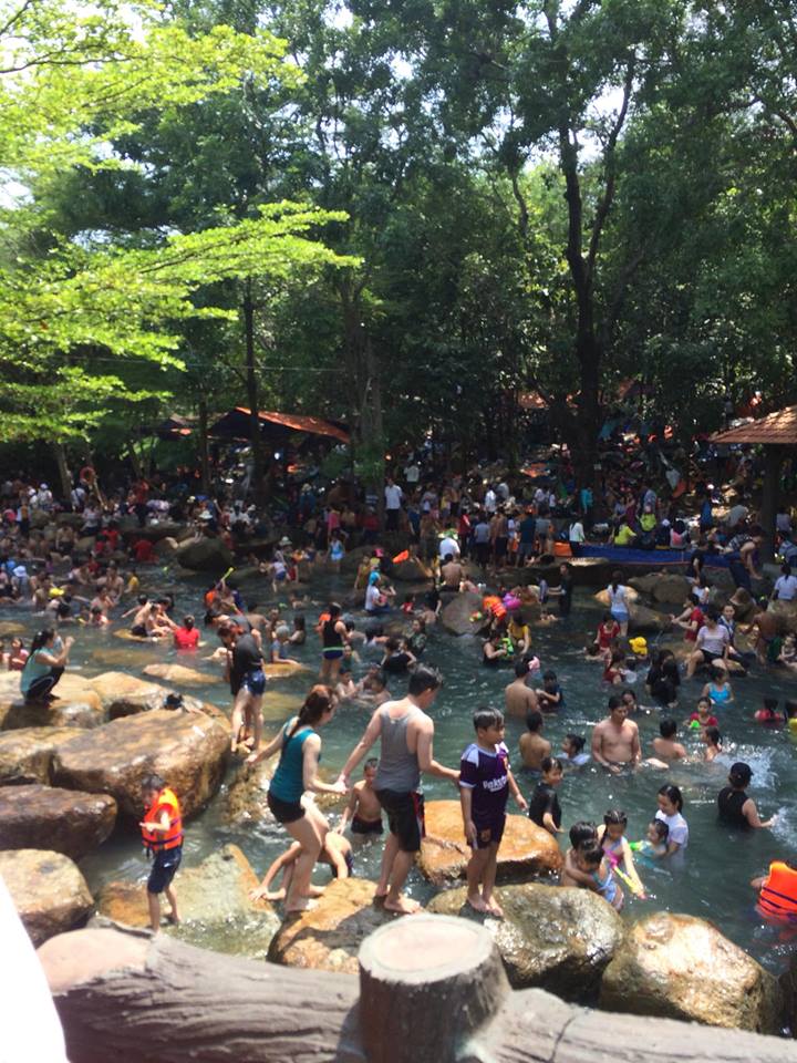 Chiều 30/4, tại khu vực khu du lịch Thủy Châu (thị xã Dĩ An, Bình Dương) chật kín người đến tham quan, vui chơi. Những đoàn người kéo đến khu du lịch này khiến những những suối nước, rừng cây, lán trại đều “thất thủ”.