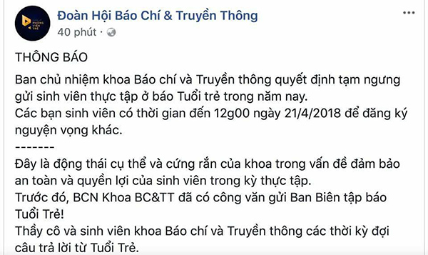 Bên cạnh đó, trên fanpage của Đoàn Hội Báo Chí & Truyền Thông đã đăng thông báo về việc gửi sinh viên thực tập được đăng tải. Theo đó, Ban Báo chí & Truyền thông quyết định ngưng gửi sinh viên thực tập ở báo Tuổi trẻ trong năm nay. Đồng thời, các sinh viên có nhu cầu thực tập sẽ đăng ký nguyện vọng khác đến 12h ngày 21/4.