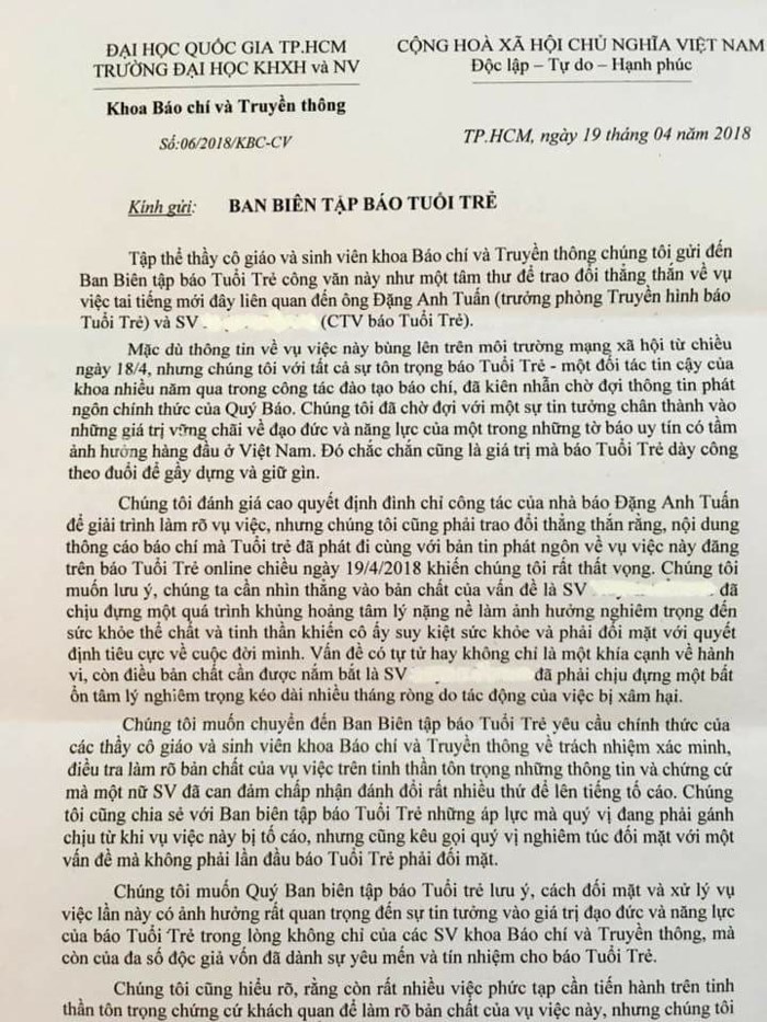 Nội dung thư gửi nêu rõ: Tập thể thầy cô giáo và sinh viên khoa Báo chí và Truyền thông chúng tôi gửi đến Ban biên tập báo Tuổi Trẻ công văn này như một tâm thư để trao đổi thẳng thắn về vụ việc tai tiếng mới đây liên quan đến ông Đ.A.T (trưởng phòng Truyền hình báo Tuổi Trẻ) và CTV báo Tuổi trẻ.
