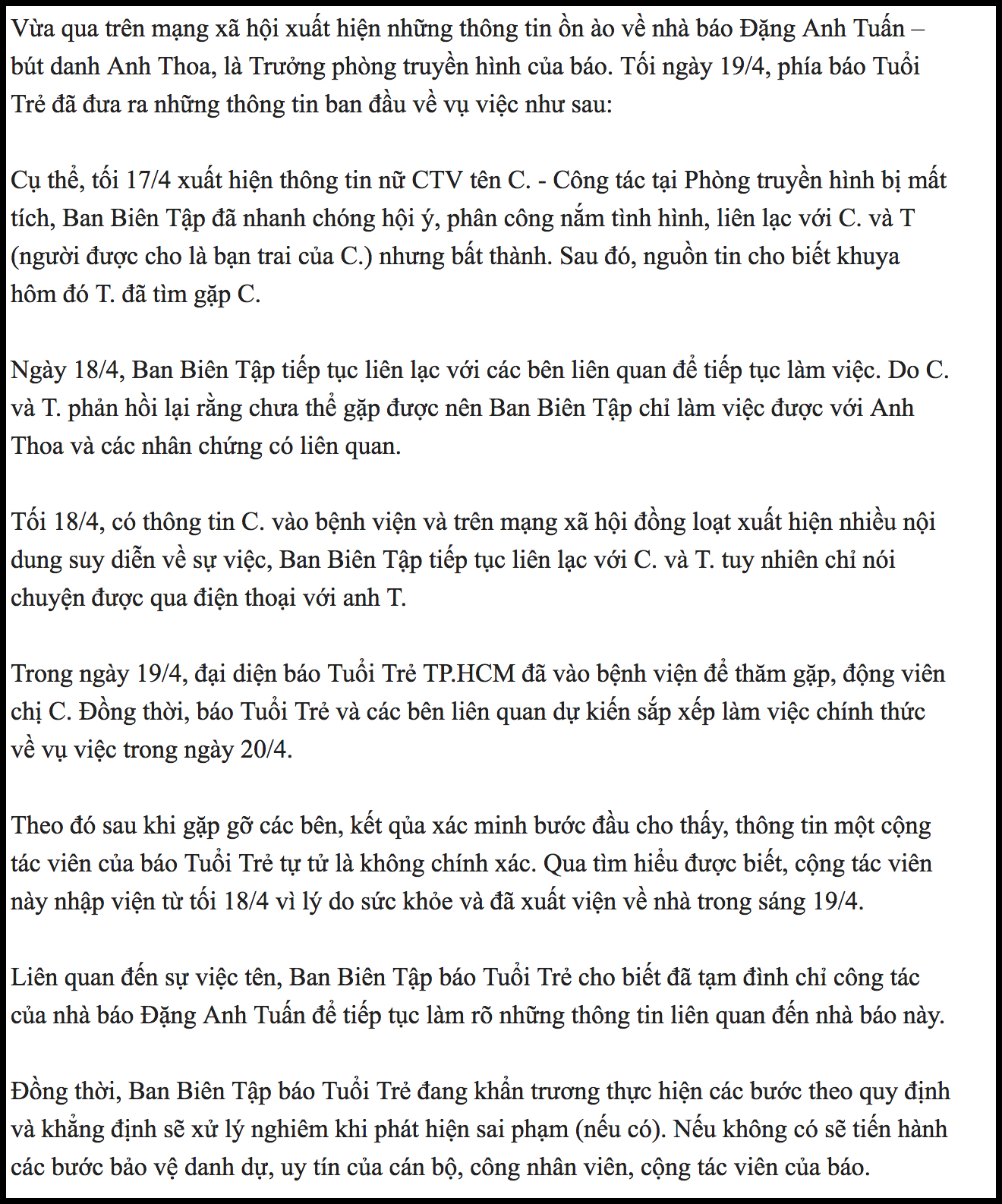 Trong thông cáo báo chí phát đi tối 19/4, phía báo Tuổi Trẻ cũng đề cập đến thông tin, cộng tác viên C. nhập viện do tự tử là không chính xác. Thực tế chị C. nhập viện vì lý do sức khỏe và đã ra viện trong sáng 19/4.