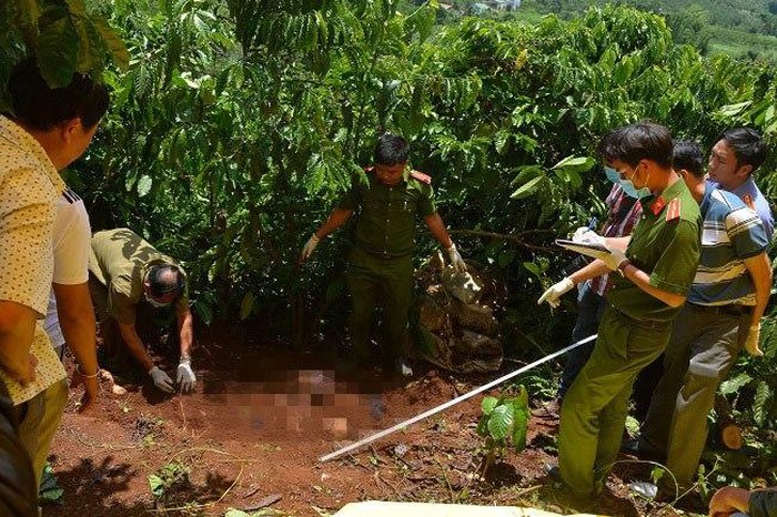 Ngày 25/5, người dân phát hiện trong vườn cà phê nhà bà Nghiêm Thị Nhi có dấu đất mới đào và cánh tay nhô lên.