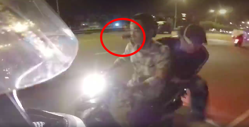 Một lúc sau bất ngờ xuất hiện hai người đàn ông lạ mặt đi tới. Hai người này lớn tiếng nói gì đó rồi đạp mạnh vào đuôi xe của nam thanh niên. Trên tay hai người đàn ông này cầm một vật nghi là súng. Nhận thấy nguy hiểm, người này tăng ga bỏ chạy thục mạng dù lúc đó anh ta đang đi ngược chiều.