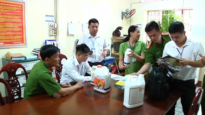 Nhiều dụng cụ dùng để bôi, nhúng sầu riêng như xô chứa dung dịch nước màu vàng; gần 20 chai hóa chất; khoảng 30 kg tem có in nhiều loại chữ nước ngoài; hàng chục bịch bột màu không nhãn hiệu và bịch kích thích sinh trưởng hiệu Lunar 150WP dùng để phun trên lá sầu riêng cũng đã được phát hiện tại cơ sở này.