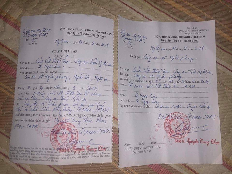 Giấy triệu tập của CQĐT Công an tỉnh Nghệ An