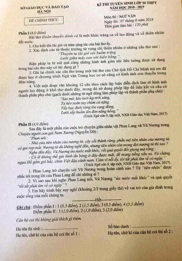 Đề thi tập trung vào các chi tiết trong 2 bài thơ: “Đoàn thuyền đánh cá” và “Chuyện người con gái Nam Xương”. Với bài thơ đầu tiên, đề bài có phần yêu cầu thí sinh lập luận và diễn dịch, làm rõ hình ảnh người lao động trong một khổ thơ, trong đó sử dụng phép lặp để liên kết và câu có thành phần phụ chú. Phần II của đề thi yêu cầu thí sinh trình bày suy nghĩ (khoảng 2/3 trang giấy) về vai trò của gia đình trong cuộc sống của mỗi chúng ta từ tác phẩm “Chuyện người con gái Nam Xương”.