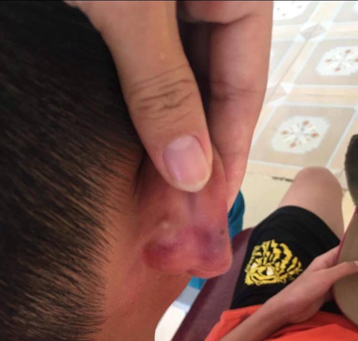 Cháu bé bị bầm tím ở mặt và nhiều nơi trên cơ thể.