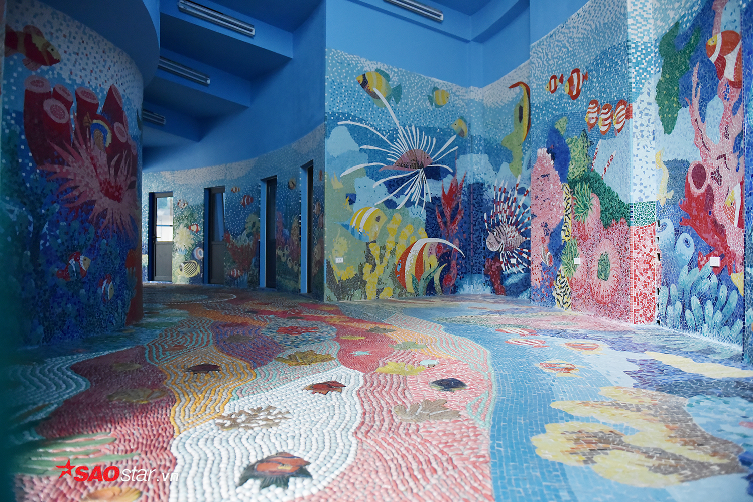 Bên cạnh đó, 50 tấm gương cũ được thay mới sáng loáng, dưới sàn là những vòng tròn nước với san hô, cá, ốc, sò gốm, sỏi gốm được những tấm gương phản chiếu vào nhau nhân lên như ống kính vạn hoa, tạo thành một mê cung vô cực lung linh huyền ảo.