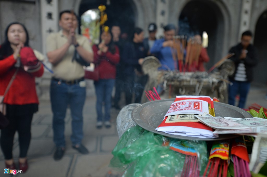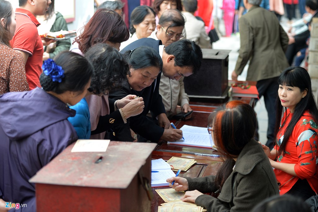 Đi chùa, nhiều người không quên đóng góp vào hòm công đức. Sáng nay, khu vực này liên tục có du khách xếp hàng ghi phiếu và để lại những tờ tiền mệnh giá từ 50.000-500.000 đồng.