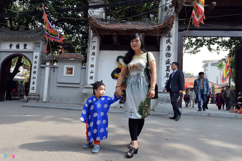 Bé Vũ Minh Huy được bà dắt đi vãn cảnh chùa Hà lúc 11h.
