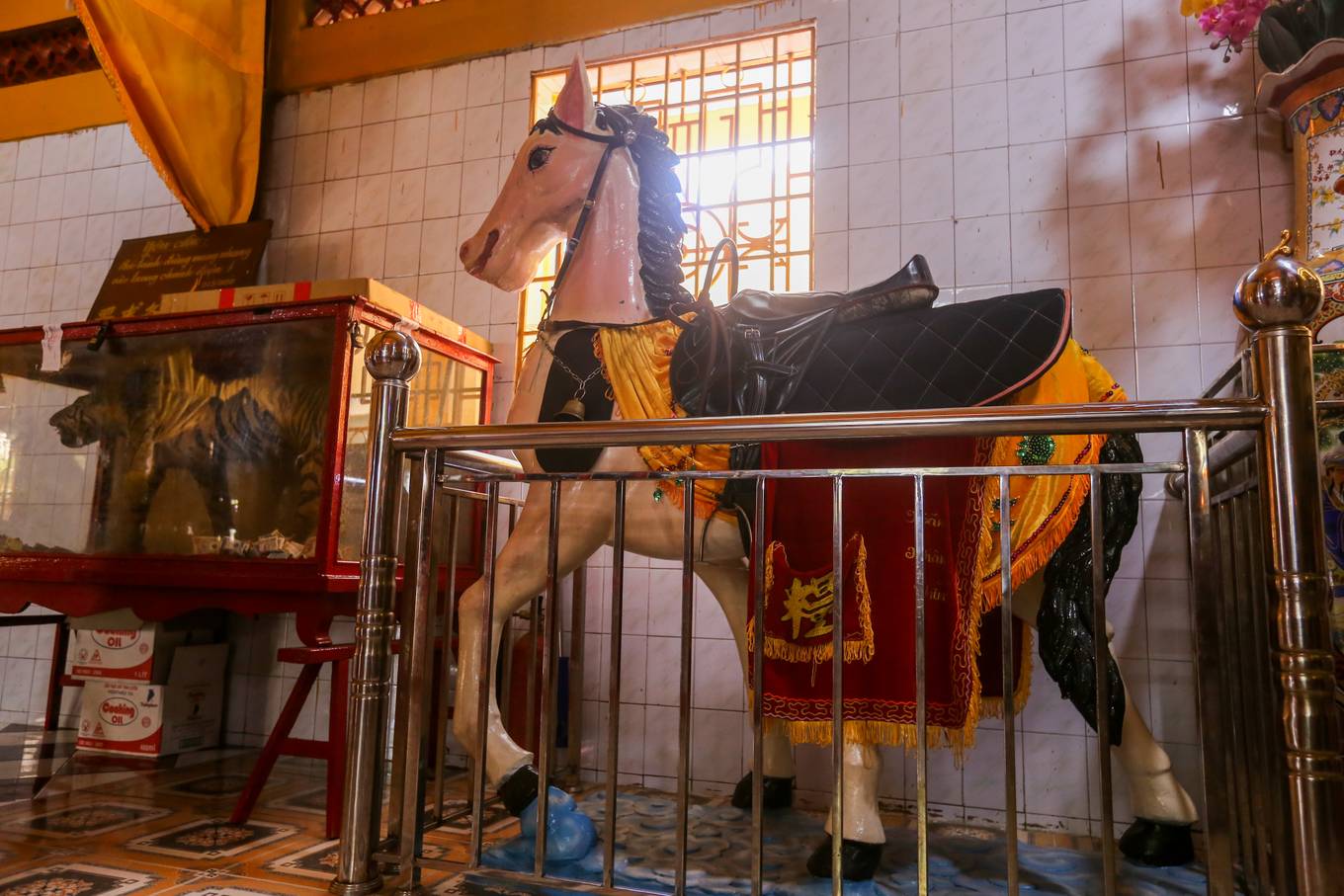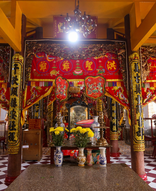 Trong chánh điện vẫn giữ được các hiện vật như toàn bộ khám thờ thần, Tả Hữu ban, Hội đồng, bộ bát bửu… Ở hai bên chánh điện là hình tượng hai con ngựa đen, trắng biểu tượng cho sự uy linh, tôn nghiêm và tính cân xứng.