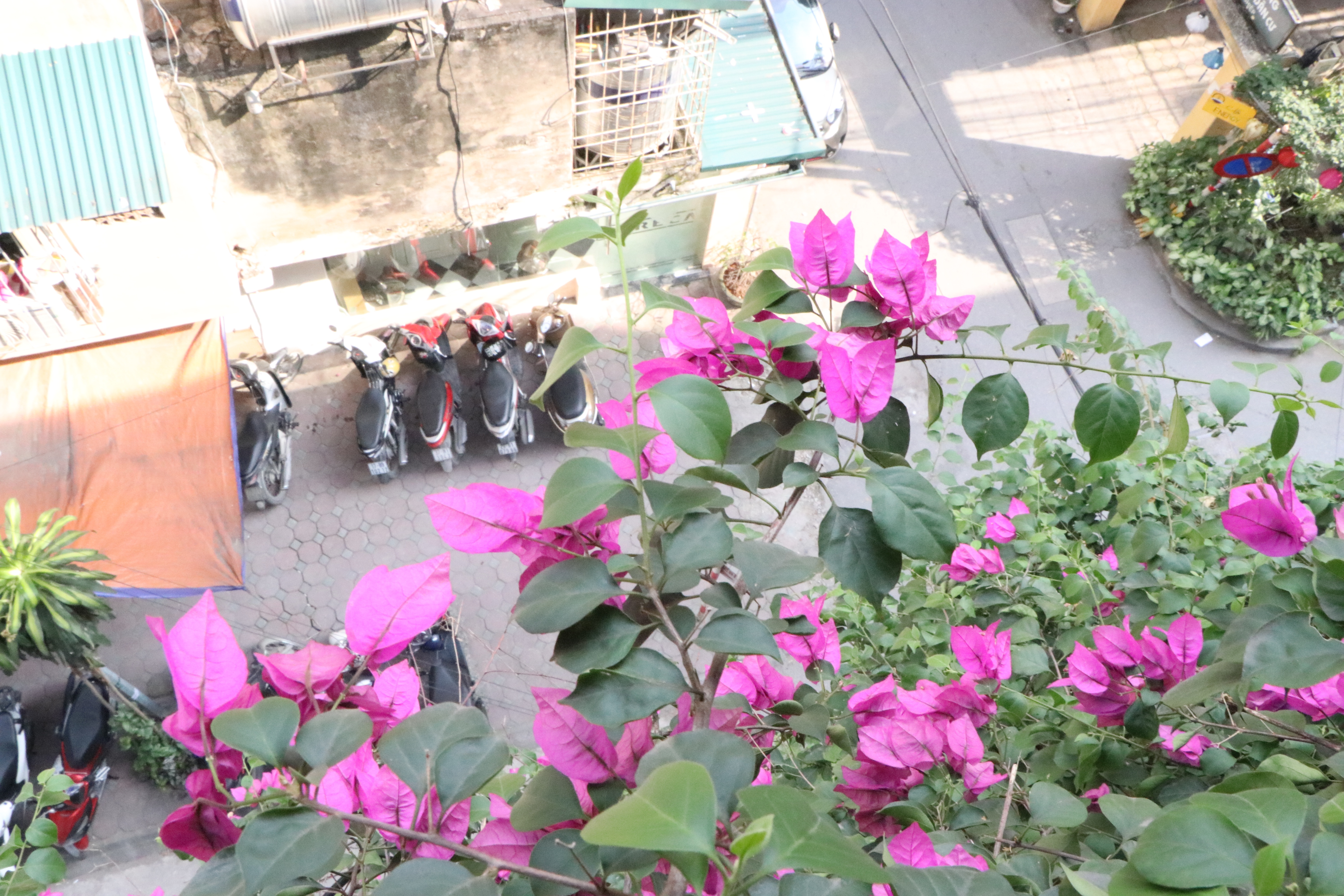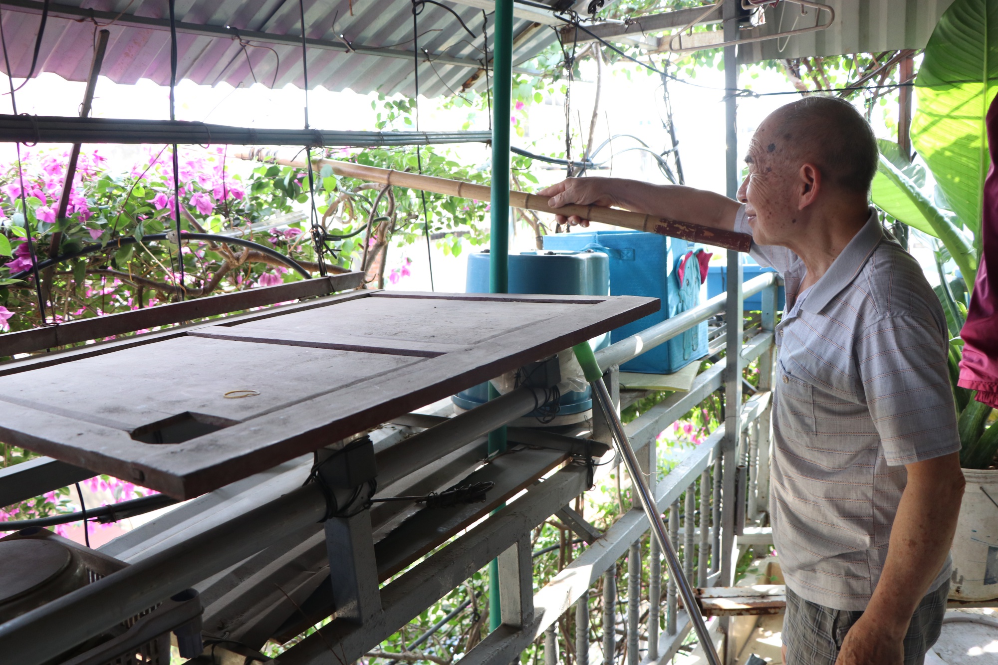 Nhờ có ông Tầng mà xung quanh mọi người được tận thấy giàn hoa giấy tuyệt đẹp xua đi bầu không khí nóng bức giữa hè.