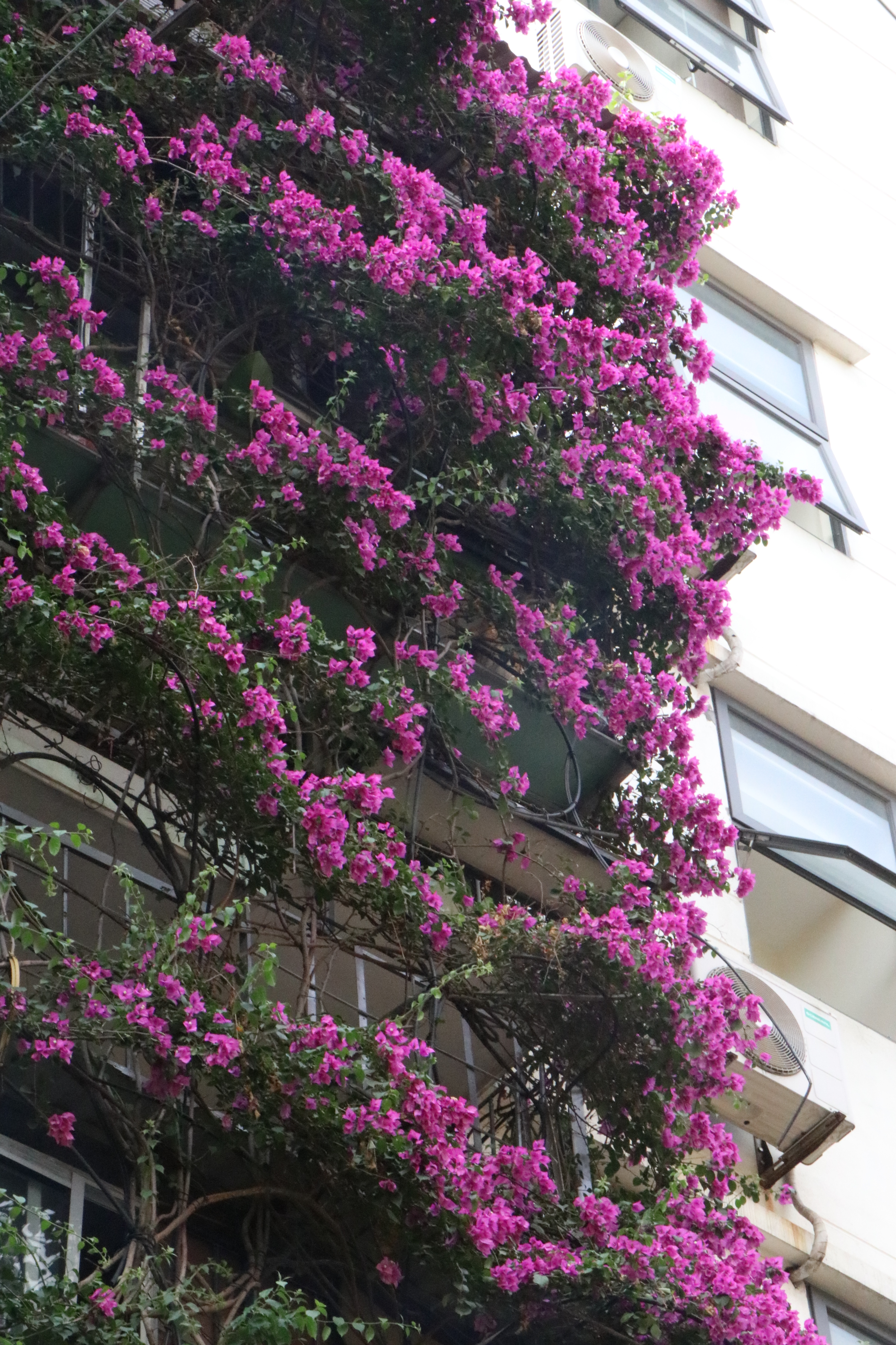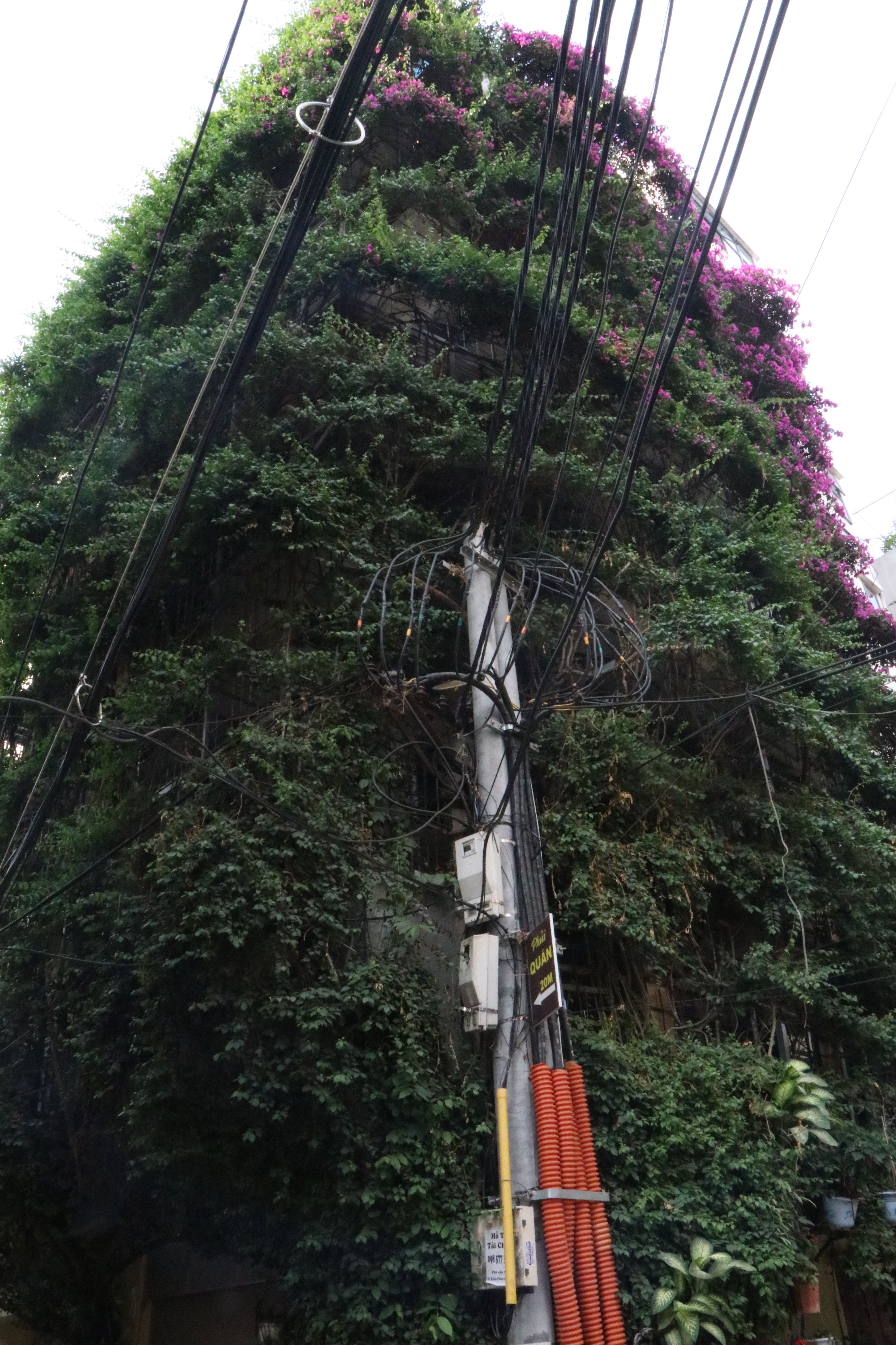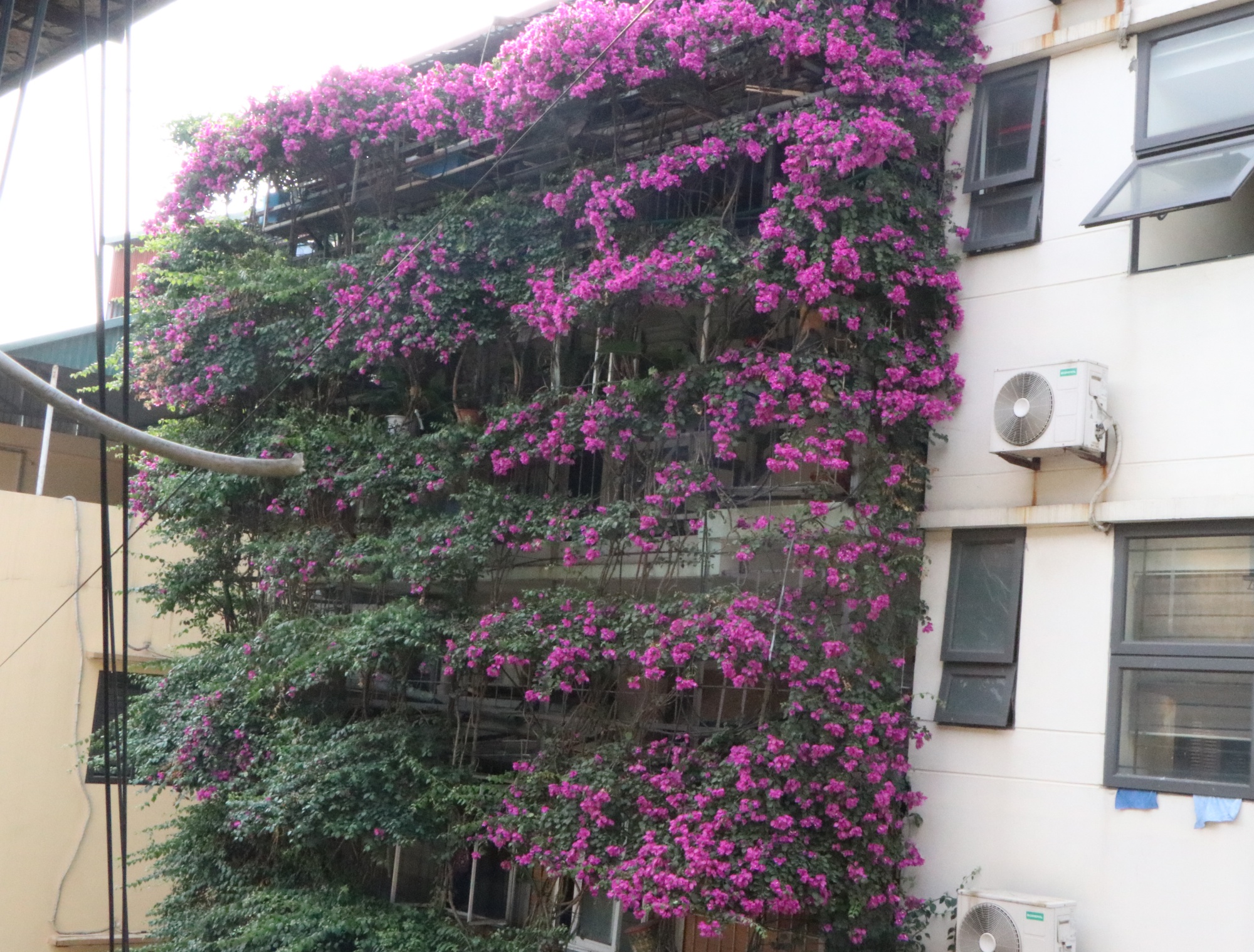 Chủ nhân ngôi nhà cho biết, trồng hoa giấy tương đối đơn giản, không tốn quá nhiều công chăm sóc. Đặc biệt, cây mọc rất nhanh, chỉ cần mất 8 - 9 năm để 2 cây hoa giấy phủ kín 5 tầng ngôi nhà. Một tháng từ 1-2 lần, ông Tầng dành thời gian để cắt bớt các cành cây thừa, hoặc tỉa tót những cành đã hư hỏng, tránh hiện tượng rơi, đổ cành cây khi trời mưa bão.