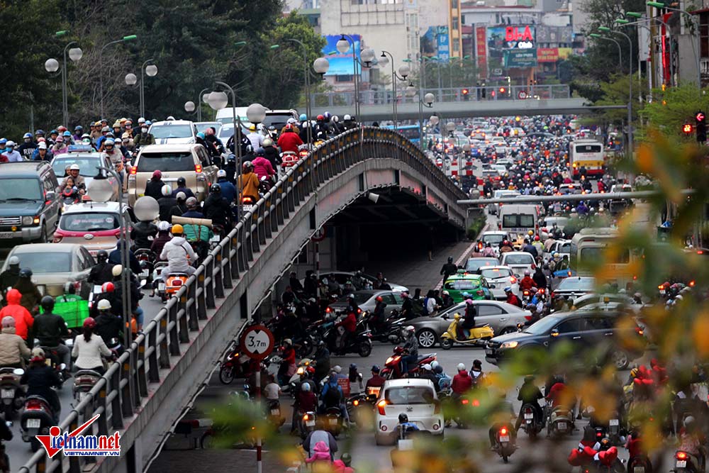 Cầu vượt Ngã Tư Sở hướng về Thanh Xuân cũng đông nghẹt. Ảnh: Đoàn Bổng