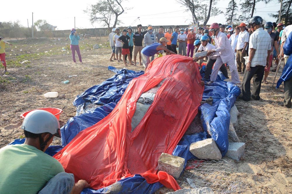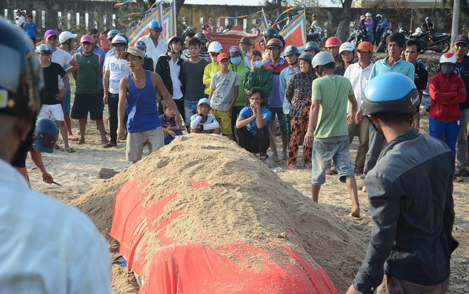 Xác cá Ông được ngư dân chôn cất tiến hành theo nghi thức địa phương.
