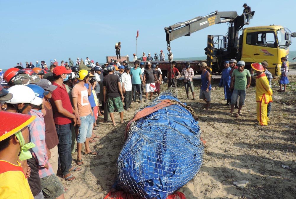 Khi phát hiện, xác cá đang trong giai đoạn phân hủy, bốc mùi. Các ngư dân liền lai dắt vào bờ để làm lễ an táng theo nghi thức địa phương.