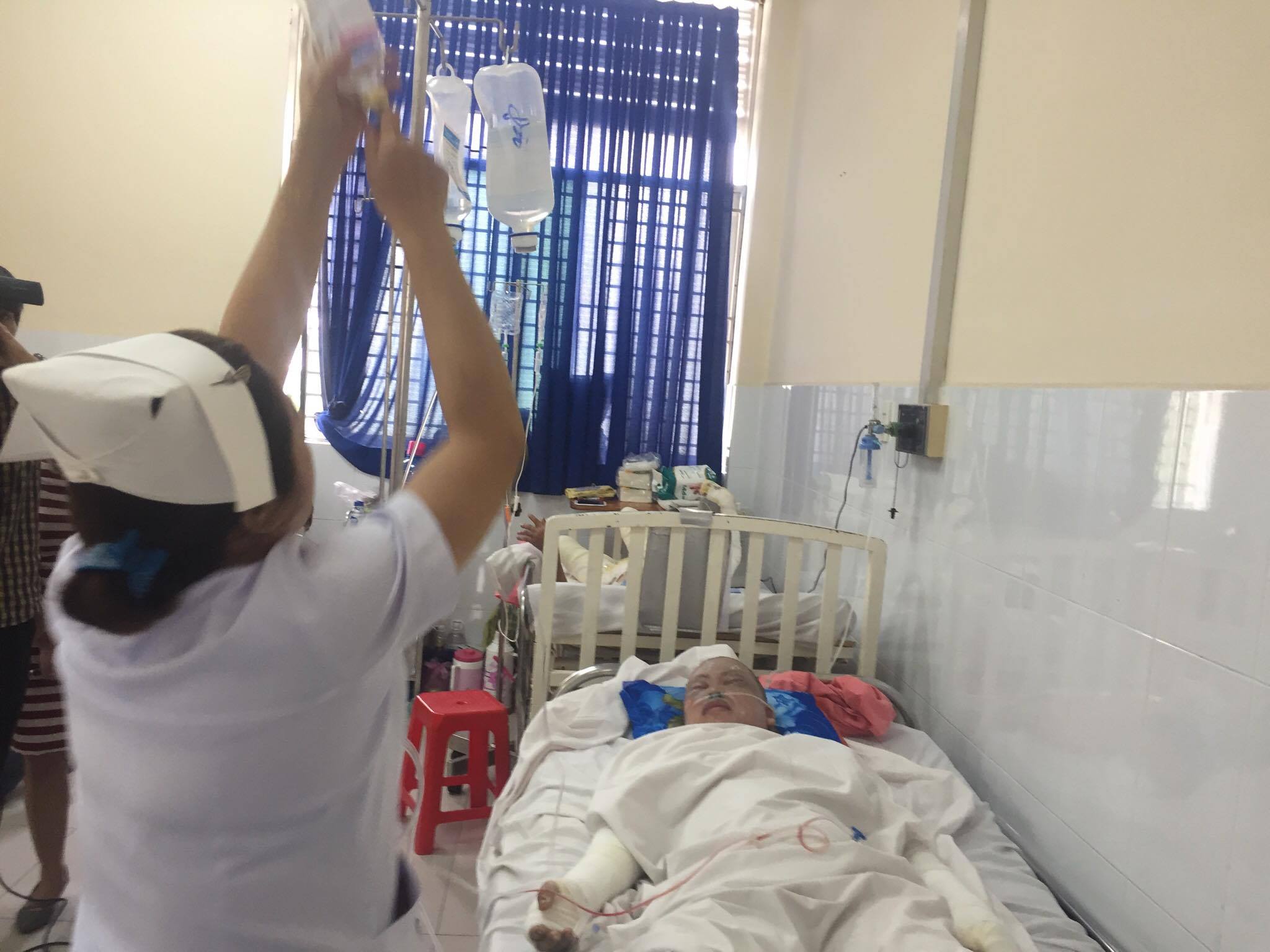 Các bác sĩ đang điều trị kháng sinh, chống sốc bỏng, truyền dịch, bù điện giải, thay băng vết thương.