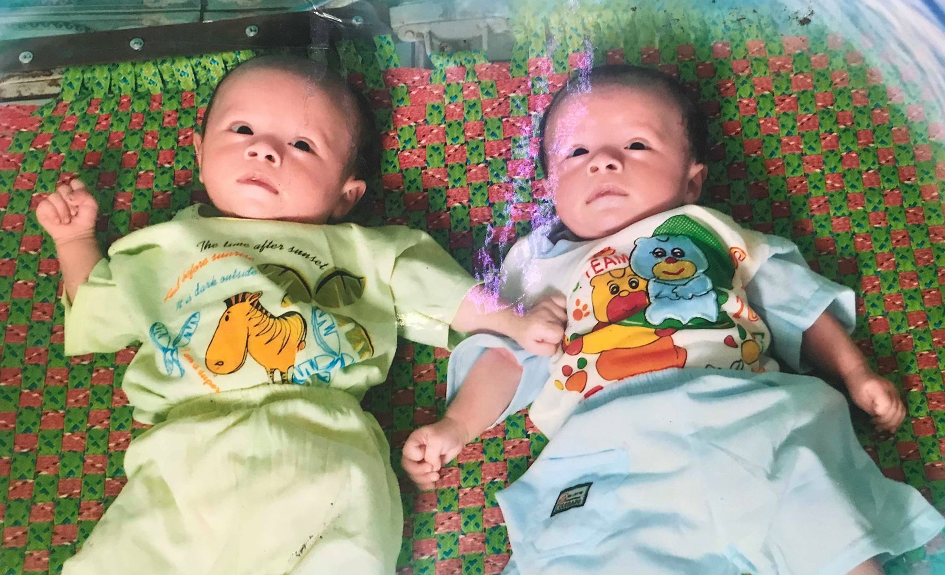 Hai bé Bảo Quốc, Bảo Khánh khi mới 9 tháng tuổi được bà Cúc giúp đỡ, chăm sóc.