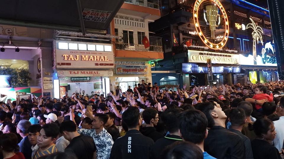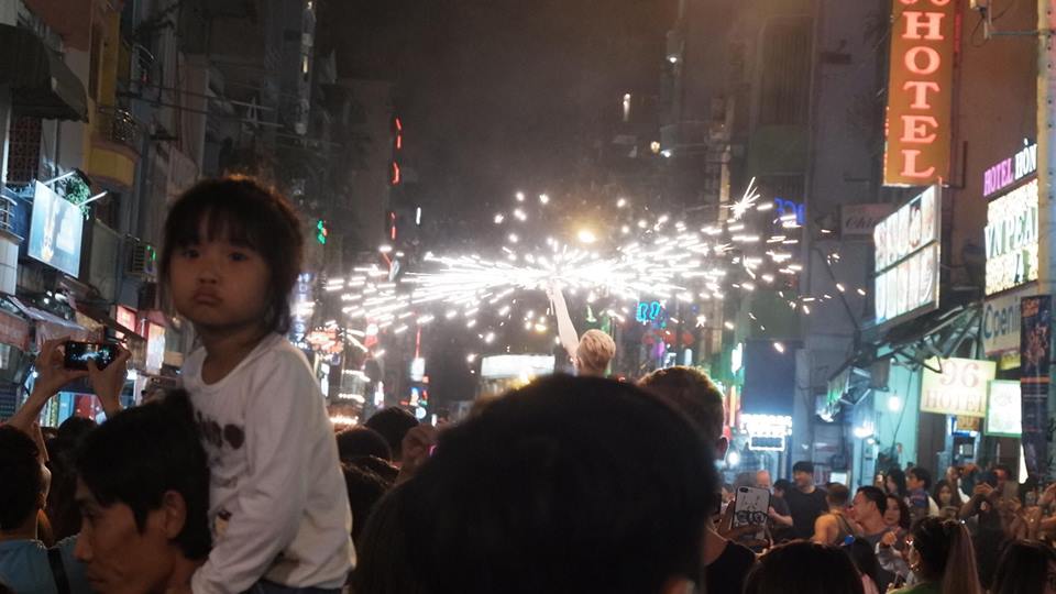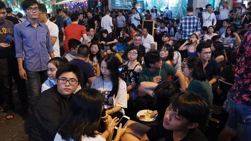 Tại phố Tây Bùi Viện, hàng nghìn người đã đổ về đây để chào đón năm mới 2018. Sân khấu Countdown được trang bị dàn âm thanh ánh sáng hiện đại, cùng các DJ tài năng làm cho không khí trở nên “hot” hơn bao giờ hết. Càng gần đến 12h, lượng người đổ về Bùi Viện càng đông, đường chật cứng không thể di chuyển được.