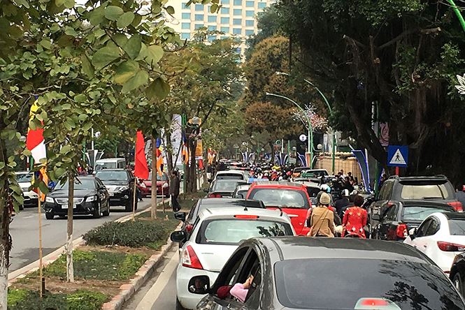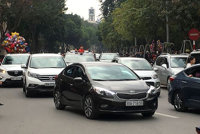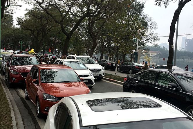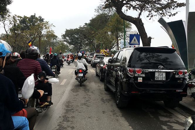 Nhiều xe ô tô đỗ dọc hai bên đường Thanh Niên vào lễ chùa khiến lòng đường chật hẹp đi nhiều.