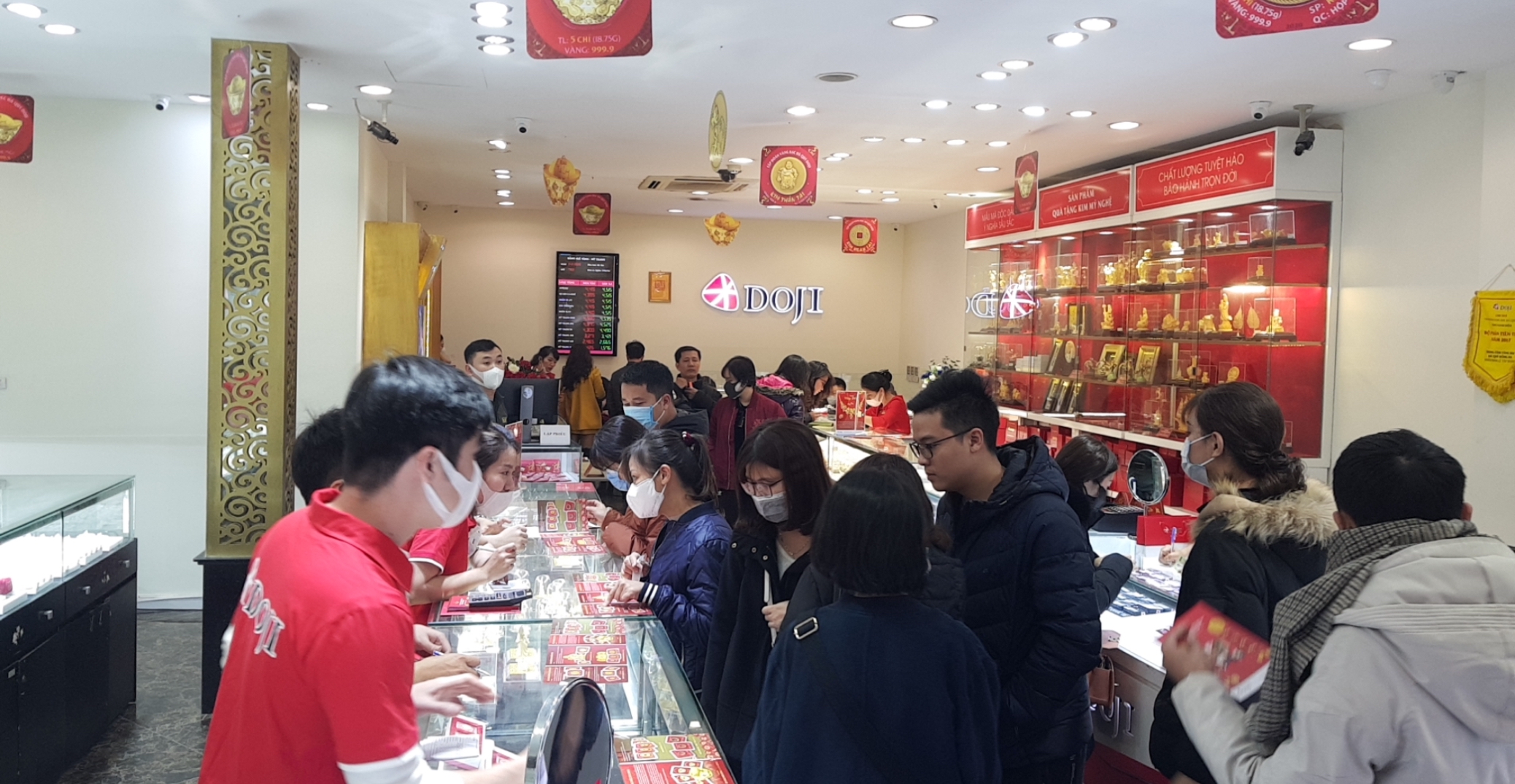 Ngày Vía Thần Tài mùng 10 Tháng Giêng năm nay rơi vào đúng thời điểm dịch bệnh này đang bùng phát nhưng theo thói quen, người dân vẫn nô nức đi mua vàng. Để phòng ngừa bệnh dịch và tránh lây lan, các nhân viên của Tập đoàn Vàng bạc Đá quý DOJI đều tuân thủ việc đeo khẩu trang và găng tay khi tư vấn, phục vụ khách hàng. Khách hàng đến mua vàng cũng được khuyến cáo đeo khẩu trang để phòng bệnh.