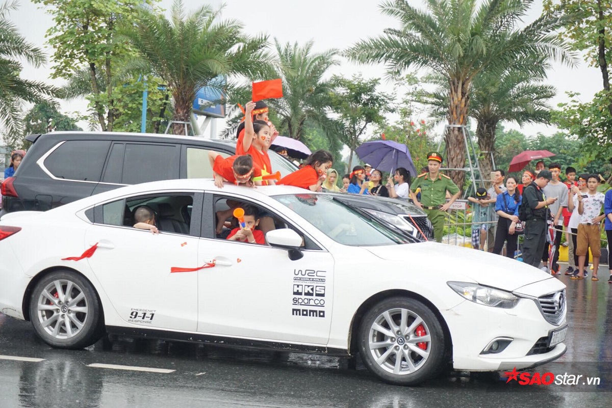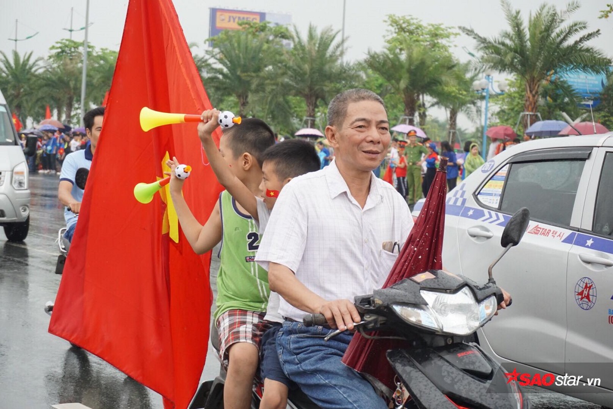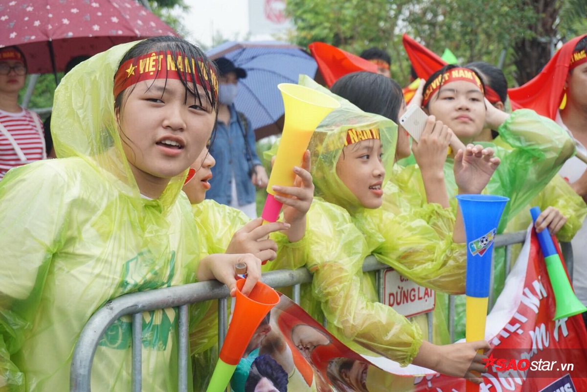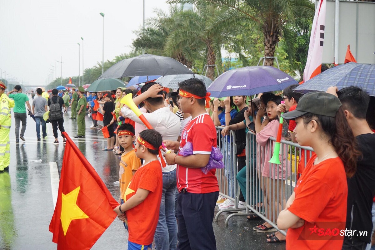 Các fans hâm mộ mặc áo mưa để đón các cầu thủ về nước.