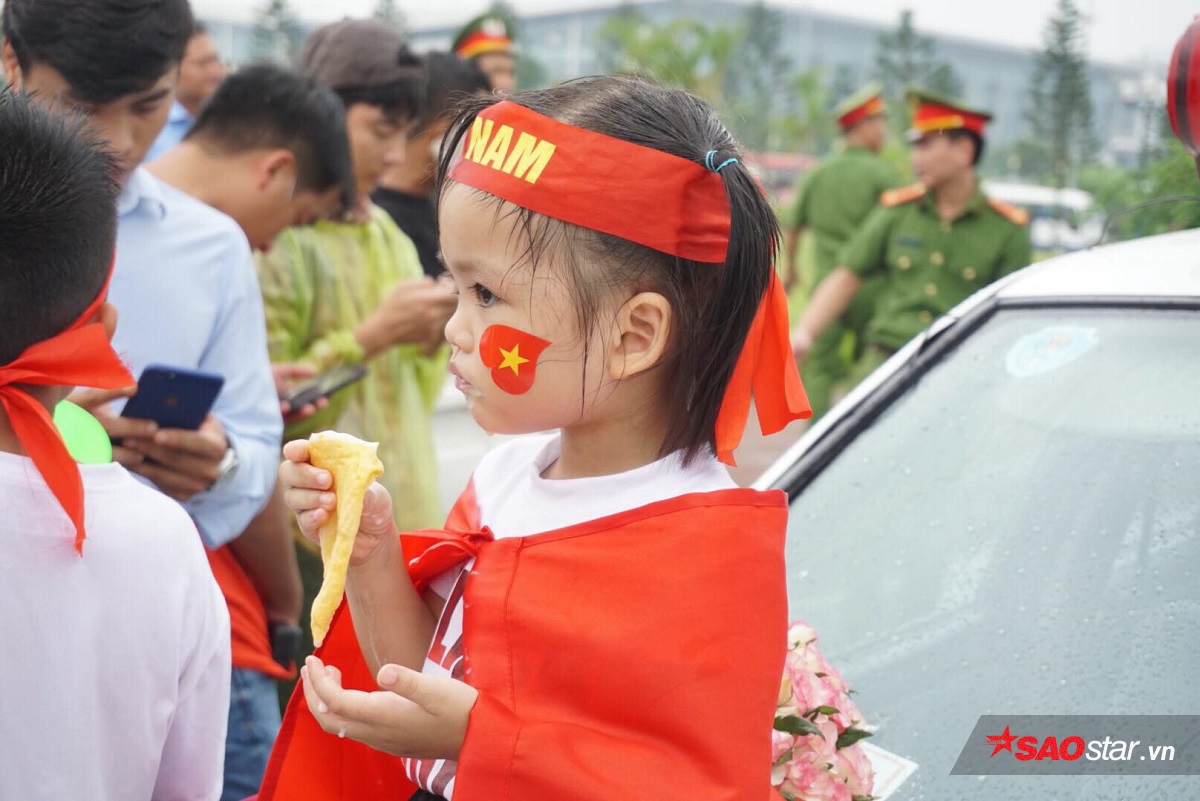 1 cổ động viên nhí theo chân bố mẹ đến đón các “chàng trai đất Việt”.