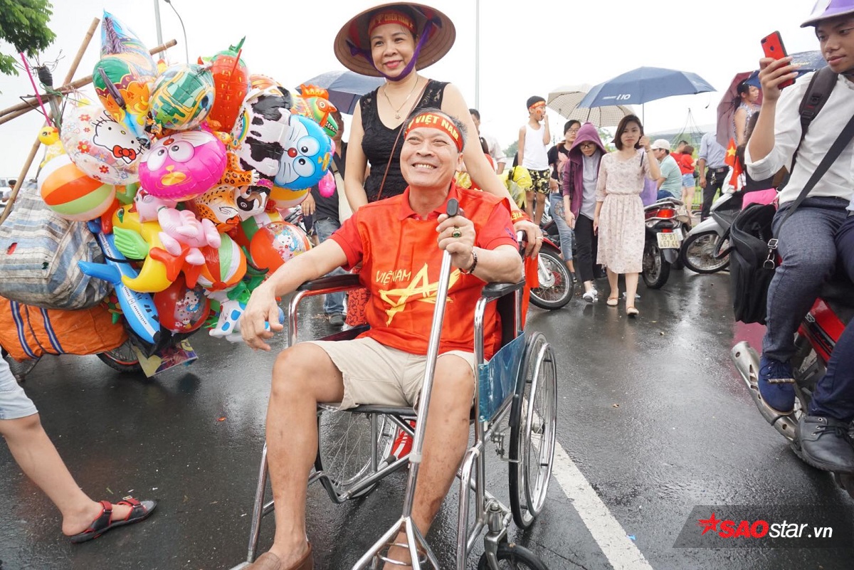 Dù không thể đi lại được nhưng ông Đinh Anh Tuấn (57 tuổi), cổ động viên đến từ Sóc Sơn, Hà Nội đã cùng vợ bắt taxi lên đón các cầu thủ Olympic Việt Nam.
