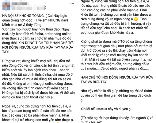 Tuy nhiên, nhiều cư dân mạng khác cũng post lời khuyên tới cộng đồng: “Việc cần làm bây giờ là mọi người đừng loạn mà di chuyển lung tung. Hãy ở yên chỗ mình đang ở, không nên đến nơi đông người. Ngày mai, hãy bình tĩnh và ở nhà, order hàng online (nếu thực sự cần), ra chợ gần nhà mua đồ đủ dùng thôi. Xin đừng tích trữ, hạn chế tới nơi đông người, rửa tay rửa tay và rửa tay“.
