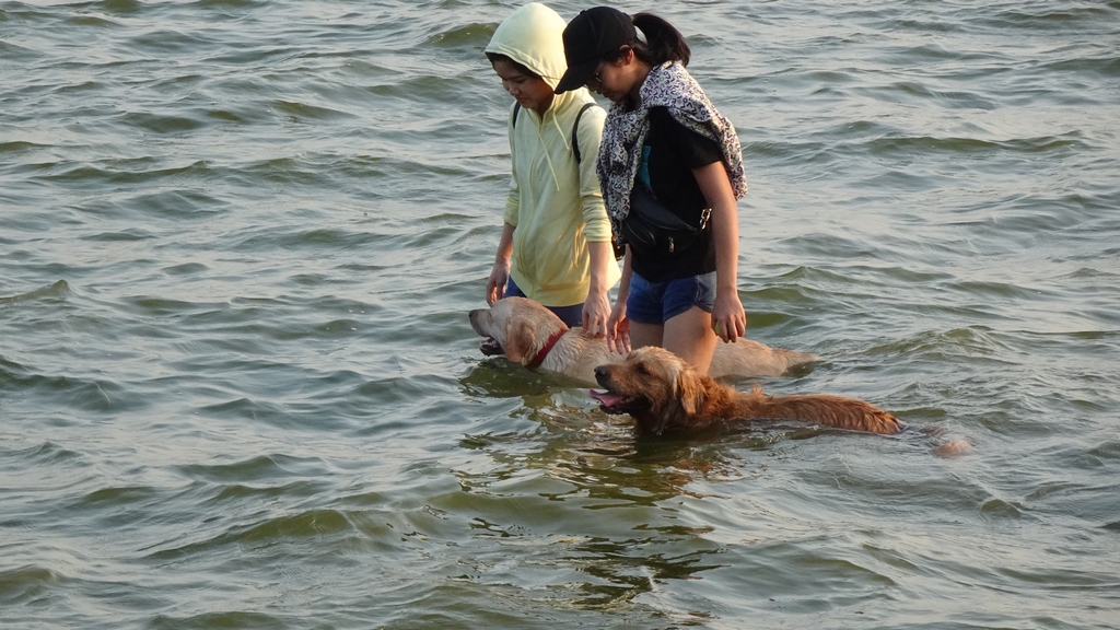 Người dân tranh chủ cho thú cưng đi tắm Hồ Tây giải nhiệt.