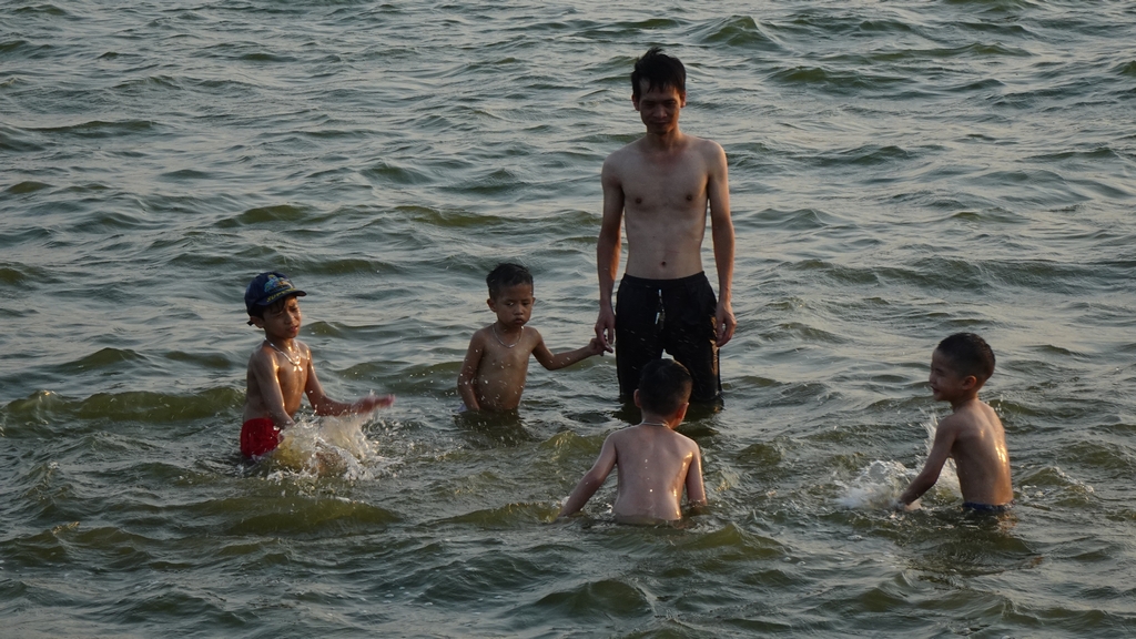 Rất nhiều trẻ em được bố mẹ đưa ra Hồ Tây tắm mát.