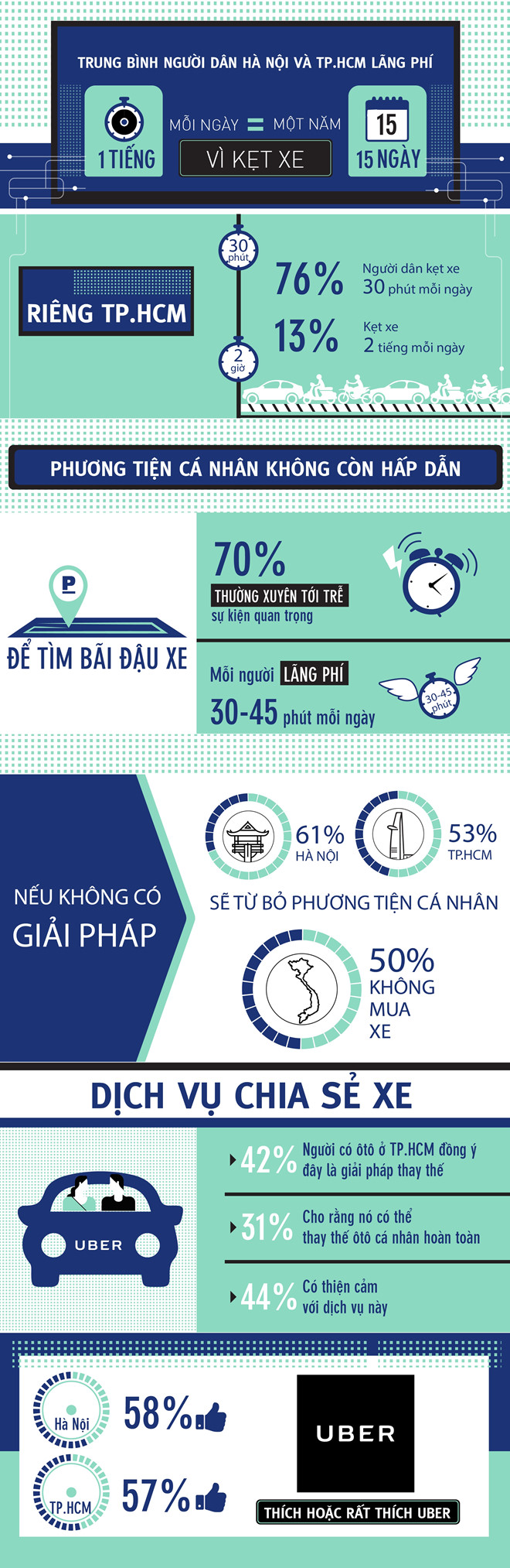 Nguồn số liệu: Uber phối hợp cùng công ty nghiên cứu thị trường Audience Project thực hiện đề án “Khảo sát về Hành vi đi lại và sử dụng các phương tiện của người dùng Việt”, nhằm góp phần tìm ra giải pháp cho việc di chuyển hiệu quả. Khảo sát được thực hiện trên hơn 2.000 người dân (độ tuổi 18 - 65) sinh sống tại Hà Nội và TP.HCM vào tháng 7-8 năm nay về các vấn đề sở hữu phương tiện, chia sẻ xe, lái xe và đậu xe.