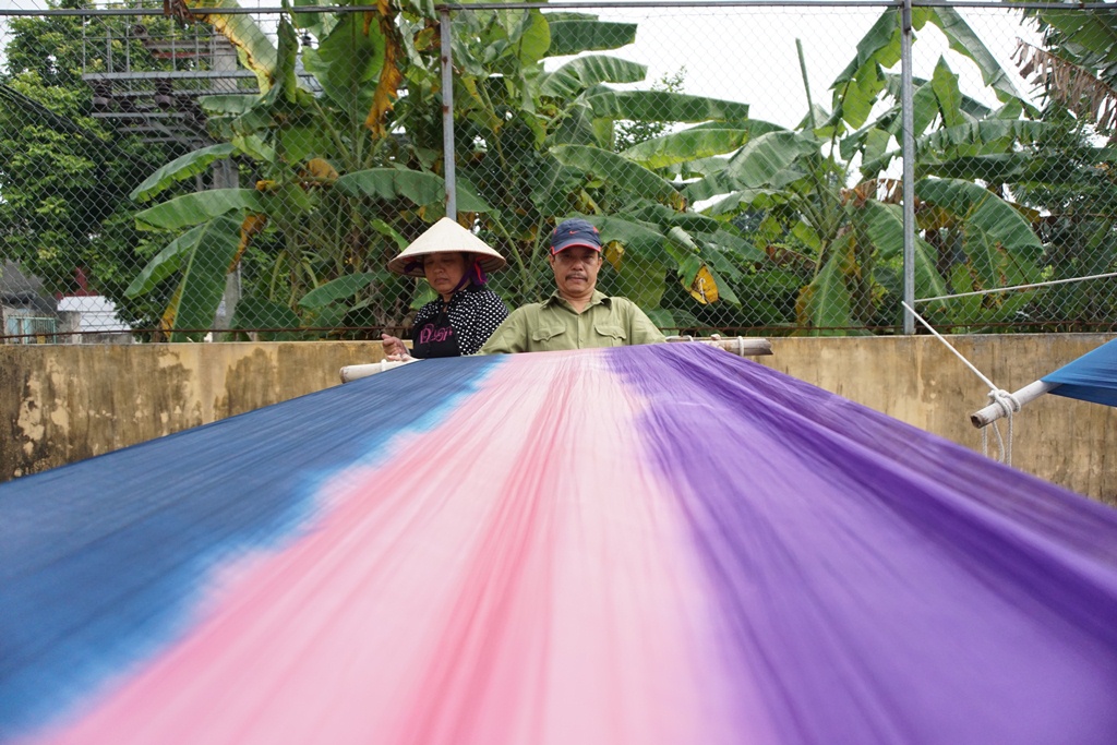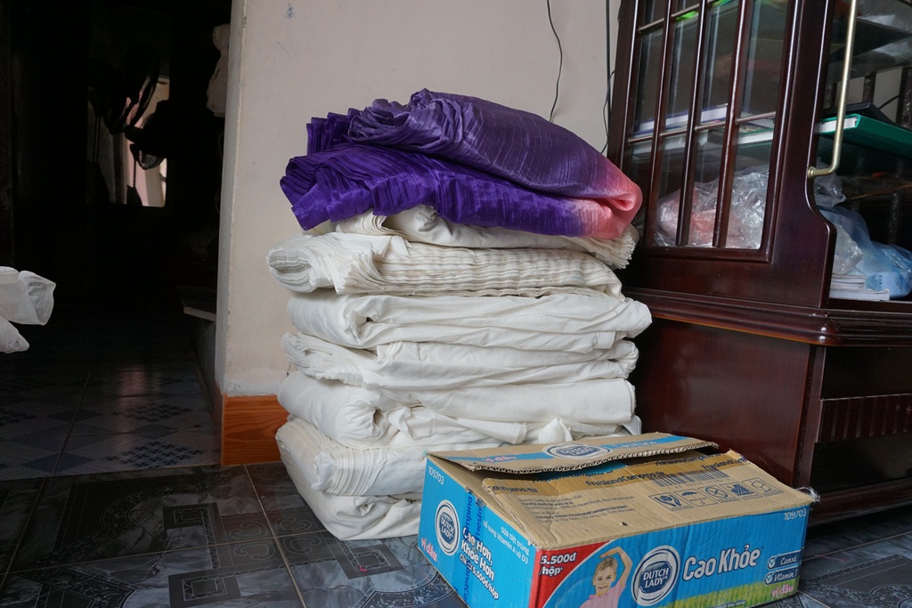 Lụa thành phẩm được người dân xếp trước khi cắt thành khăn hoàn chỉnh.