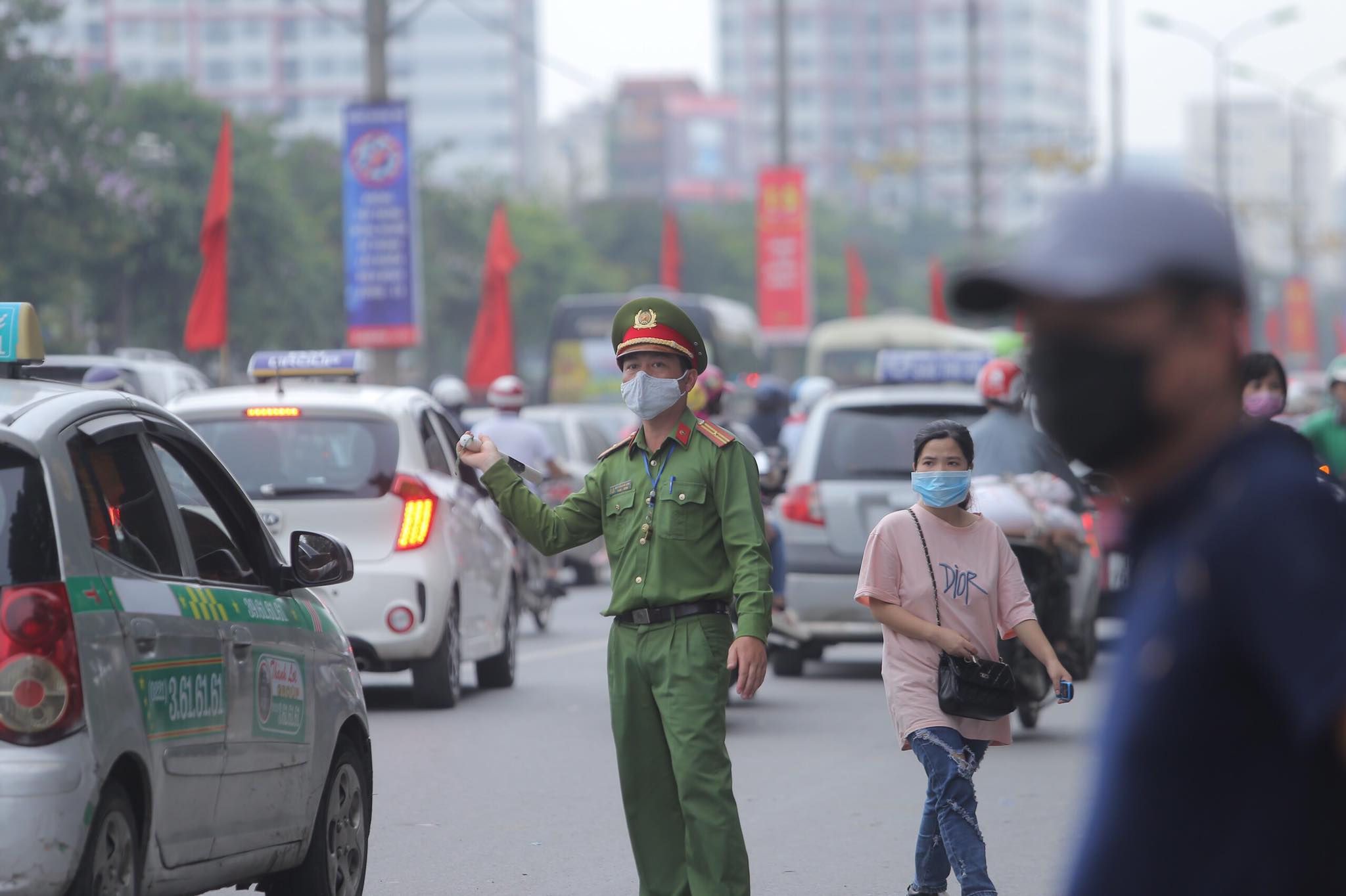 Lực lượng chức năng được huy động tại các nút giao trọng điểm và quanh khu vực bến xe để phân luồng giao thông.