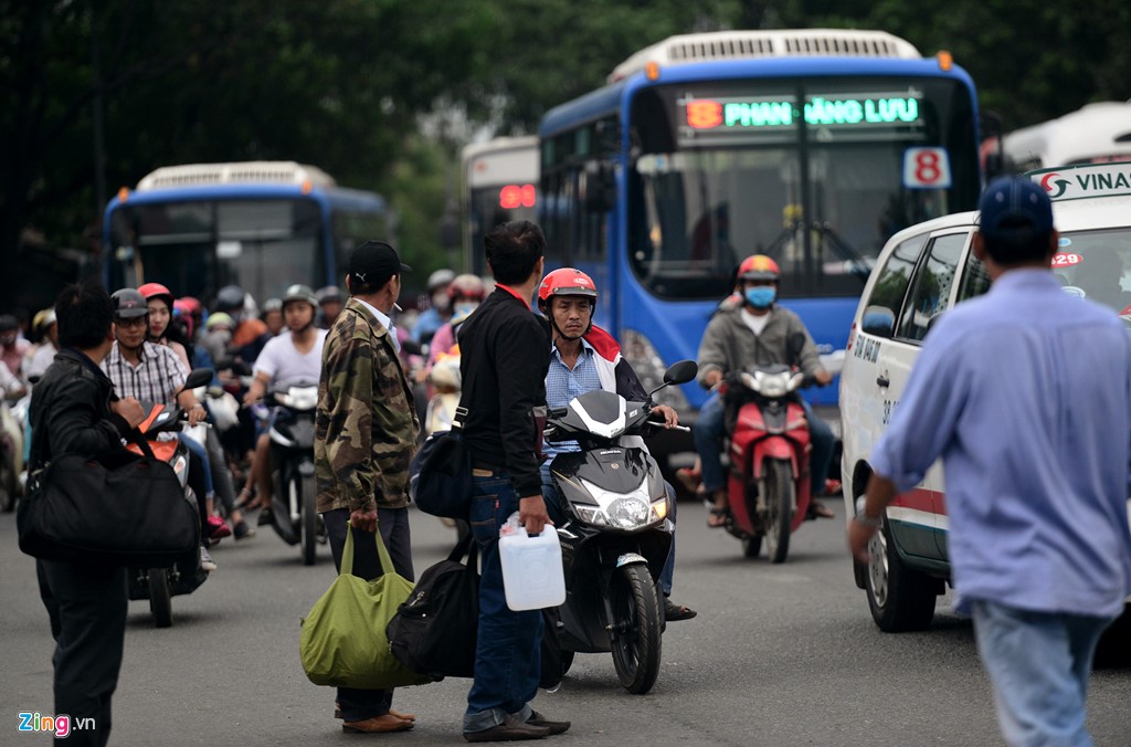 Lượng khách đổ về bến xe khá đông trong cuối chiều, nhiều người chọn xe buýt để về các quận, đứng chờ hàng dài suốt dọc bến.