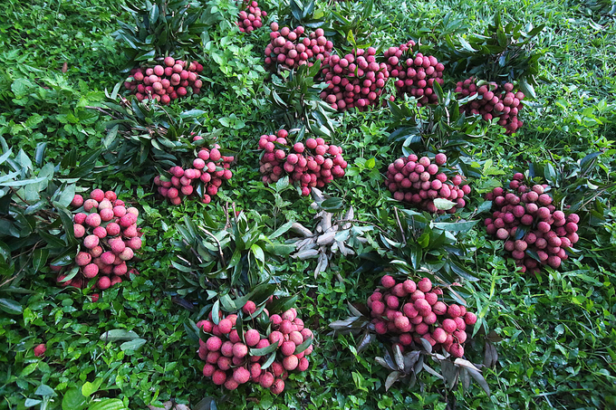 Quả vải vừa hái xuống còn nguyên sương ướt bám trên lớp vỏ.