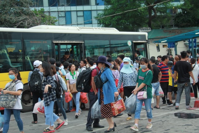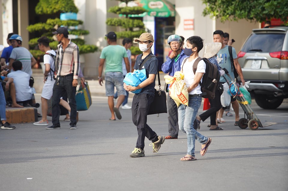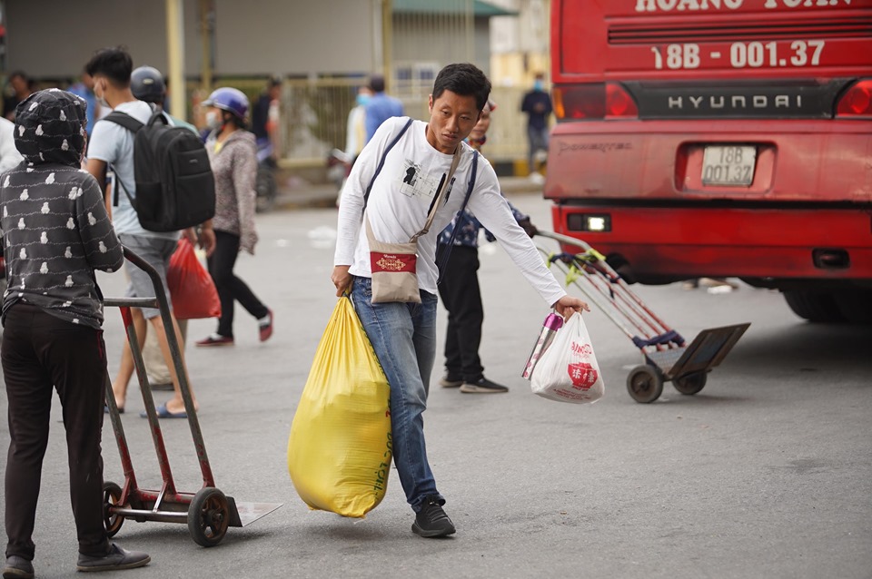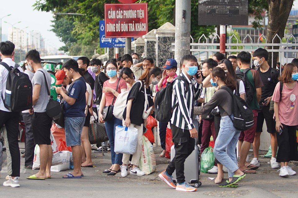 Người dân “tay xách, nách mang” nhanh chóng ra khỏi bến xe khách Giáp Bát để di chuyển tiếp chặng đường về phòng hoặc về nhà.