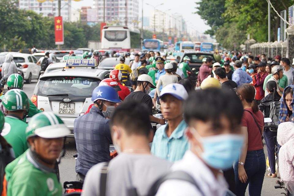 Khu vực trước cổng Bến xe Mỹ Đình nhiều phương tiện chen chúc xếp hàng, người dân đổ ra đường bắt taxi, gây ra cảnh ùn ứ, phương tiện di chuyển qua lại khó khăn.