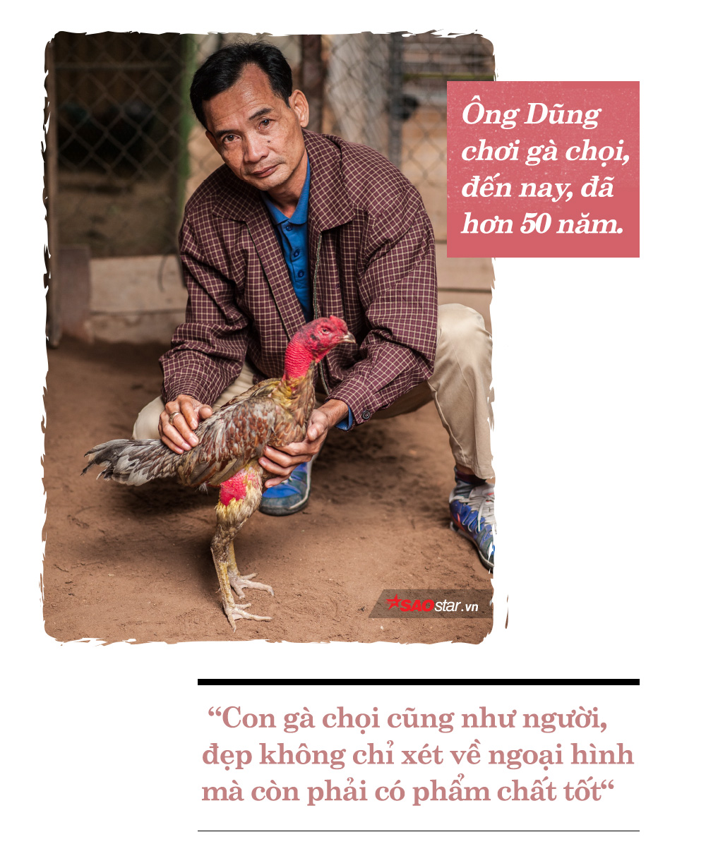 “Tôi mê gà, thích xem đấu chọi nhưng không đem nó ra cá cược, không bán gà để lấy nhiều tiền“, ông Dũng kể. Hơn nữa, gà đã đem ra sới chọi, không bao giờ người ta biến nó thành đồ ăn trên bàn nhậu. Họ yêu quý chiến kê như thú cưng nên khi ốm thì chăm sóc, lỡ mất rồi thì đem chôn cất, coi như người chiến binh đã hoàn thành những trận đấu mà nằm xuống.