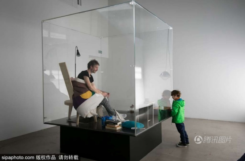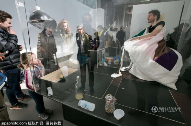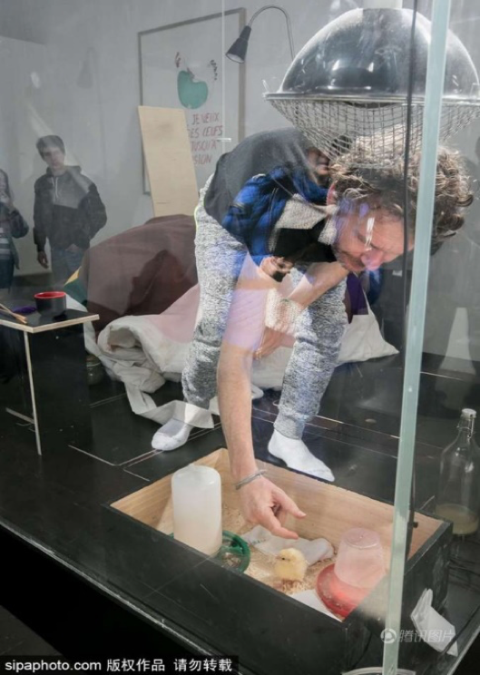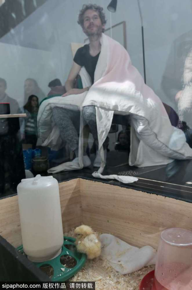 Nghệ sĩ người Pháp Abraham Poincheval đang thử nghiệm ấp trứng gà trong bảo tàng Palais de Tokyo.