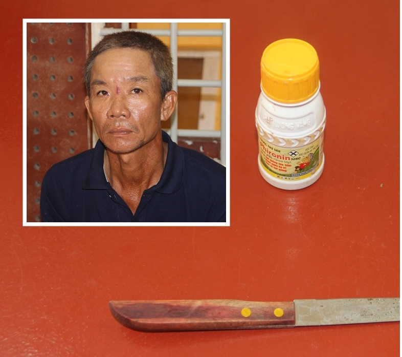 Chai thuốc sâu và con dao mà đối tượng Vương đã chuẩn bị sẵn. Ảnh: Báo Tây Ninh.